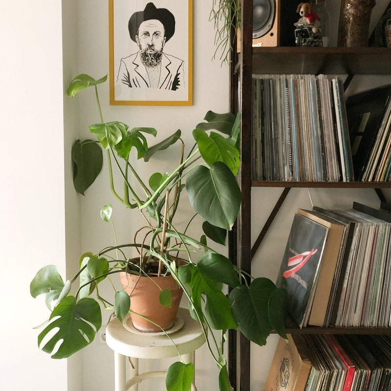 In de Zuid-Amerikaanse jungles wordt de Monstera deliciosa (Philodendron pertusem) meters hoog, de bladeren een meter breed en ontstaan er naar ananas ruikende vruchten uit de witte bloemen. Bij ons thuis gedraagt ‘ie zich rustiger. Geef flink water, maar laat tussen de gietbeurten in de grond wat opdrogen zodat de wortels niet continu nat staan. Nieuwe bladeren ontvouwen zich als een maagdelijk vel. Langzaam aan ontstaan gaten, en uiteindelijk heeft het blad z’n karakteristieke scheuren.