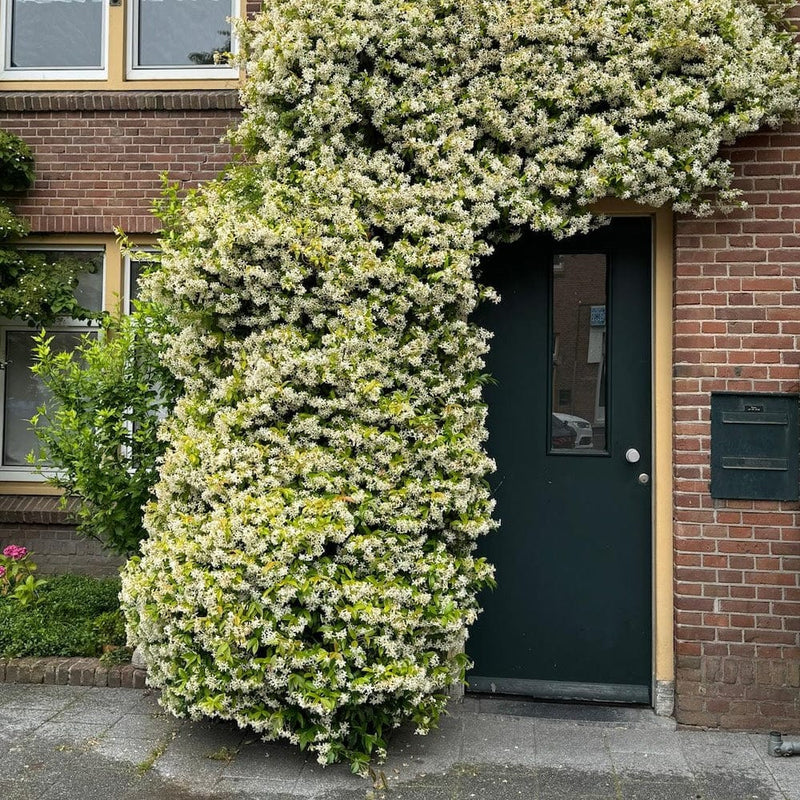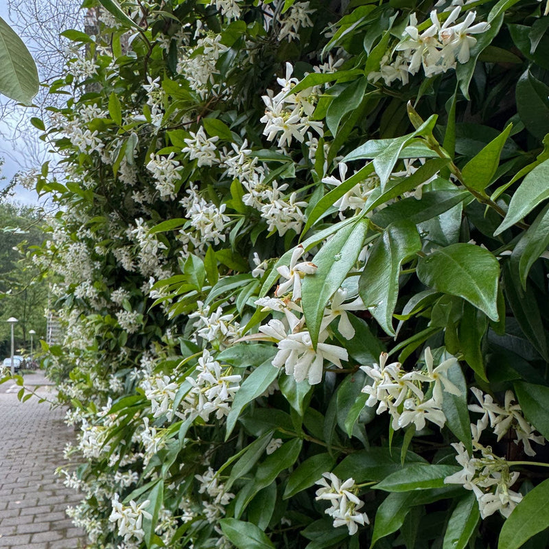 Hmmm die zoete, volle geur rond de Toscaanse jasmijn of Sterjasmijn. De witte bloemen toveren je tuin om tot een prachtig zomers paradijs. De bladeren zijn mooi donkergroen, in de winter kleuren de bladeren soms prachtig brons, waardoor je deze populaire klimplant ook in de grijze tijden kleur geeft.
