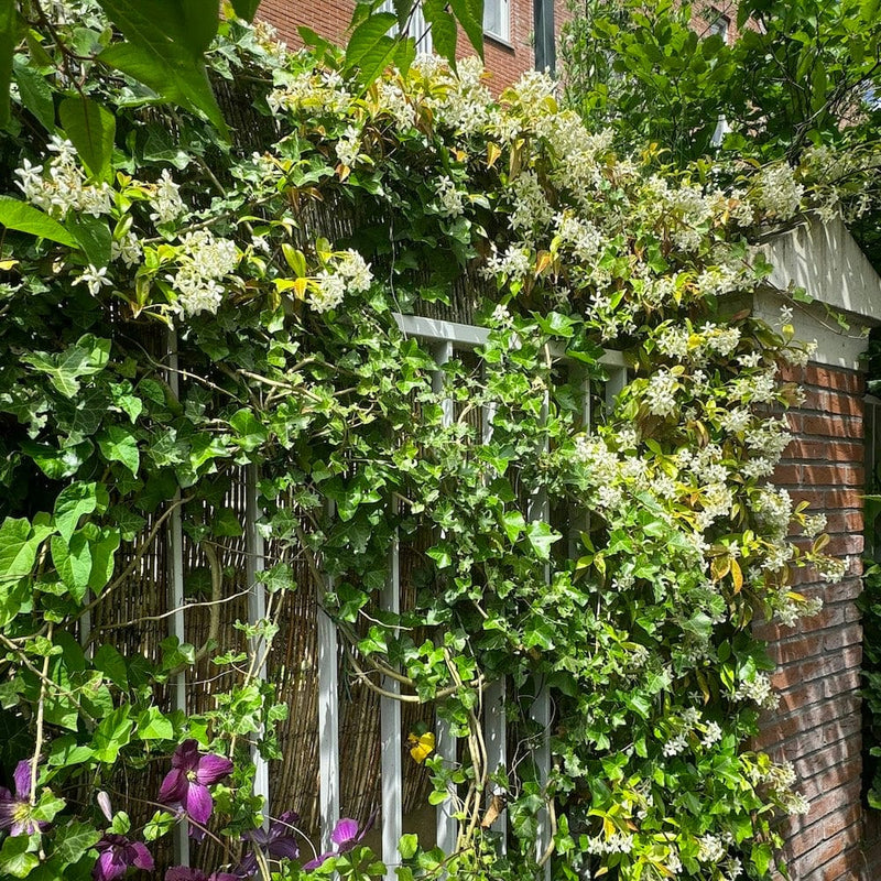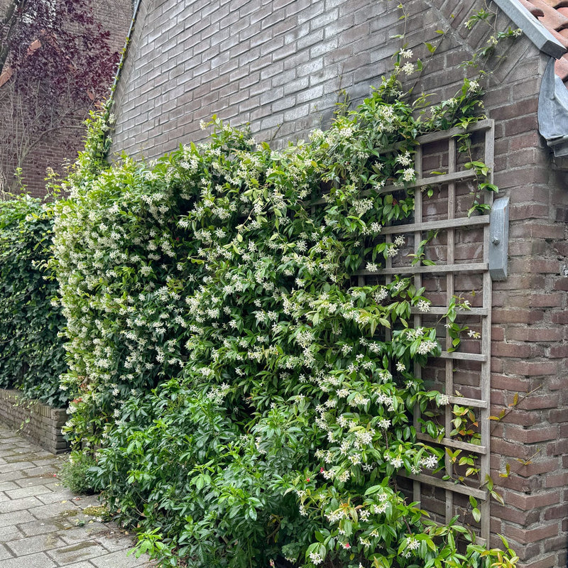 Trachelospermum jasminoides is een wintergroene klimmer die ideaal is om een schutting het hele jaar begroeid te laten. De bloemen zijn zeer geliefd bij insecten en nachtvlinders. Zorg ervoor dat deze plant niet in de volle wind staat. Voor het volledig bedekken van een schutting heb je ongeveer drie planten per strekkende meter nodig. Is een langzame groeier, dus heb geduld. Het is het waard!