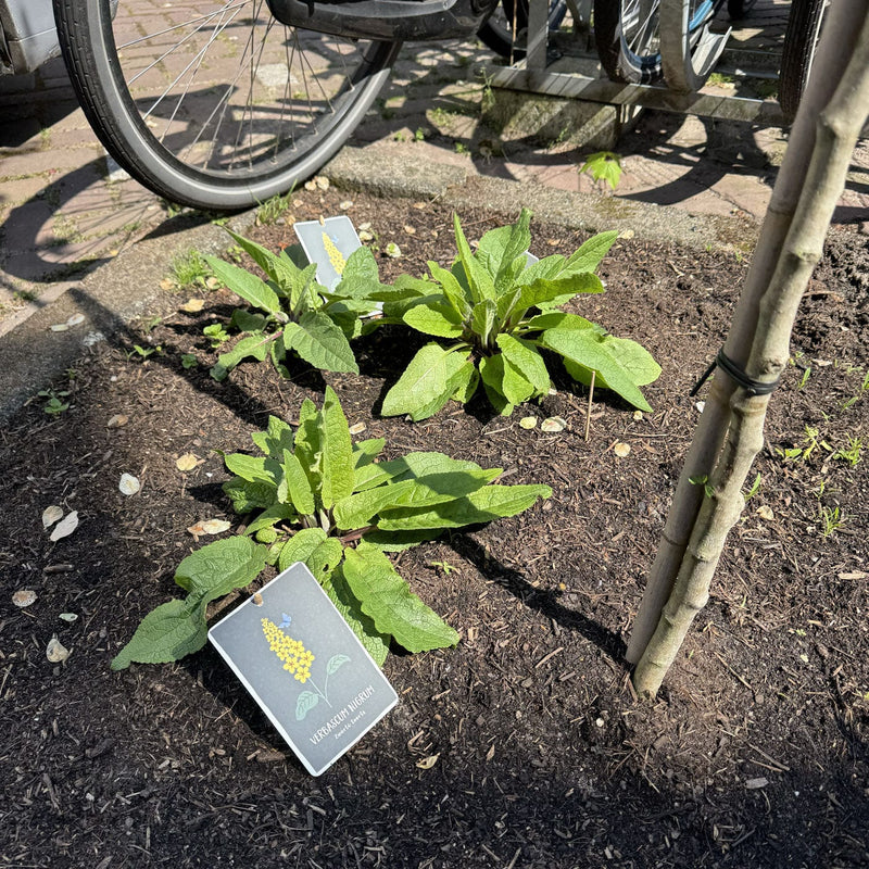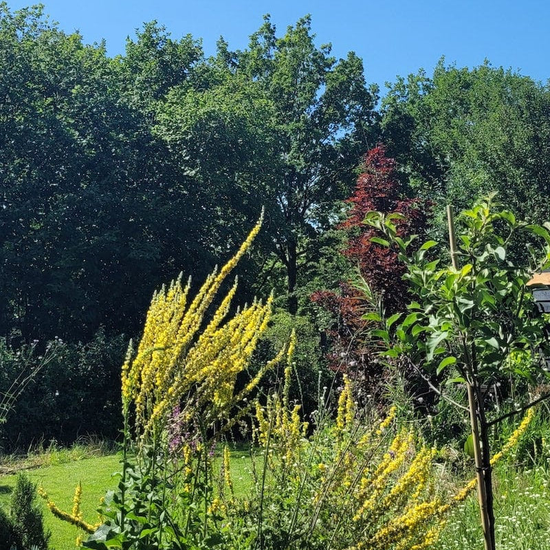 Kijk die rode kern nou in die gele bloemen! Zo mooi! Vlinders, wilde bijen en zweefvliegen vallen ook voor de pracht van deze inheemse Verbascum nigrum. Groeit recht de lucht in met grote aren voor de bloemen. Wil een plek in de zon, kan op elke goede tuingrond als er maar geen water blijft staan. Biologisch gekweekt, natuurlijk.