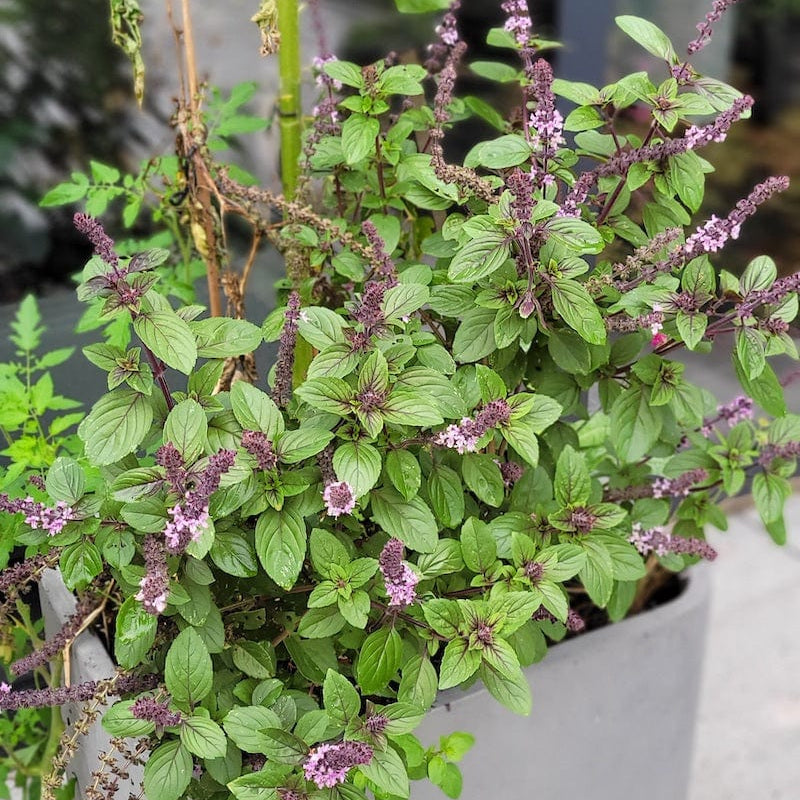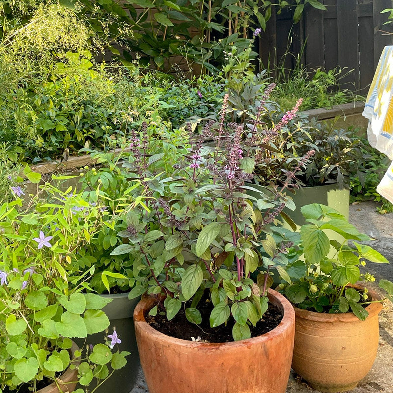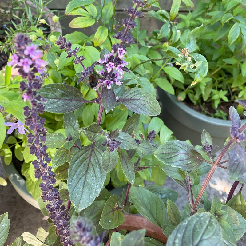 Deze roodbladige basilicum kan niet tegen vorst, haal het plantje dus binnen tijdens de winter. De bloemen zijn heerlijk voor bijen, maar als je deze verwijdert, wordt het struikje voller.