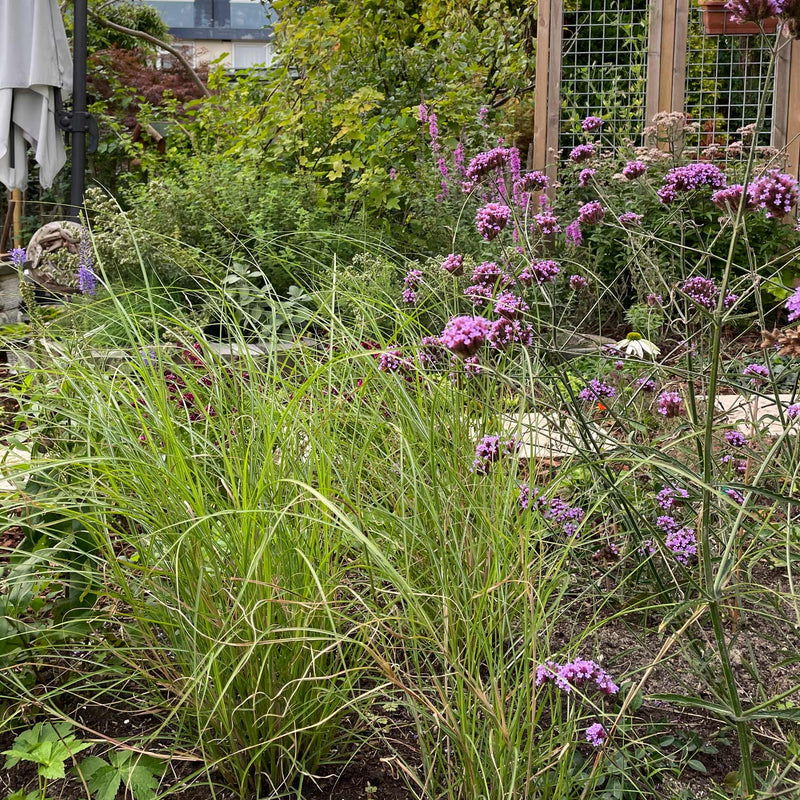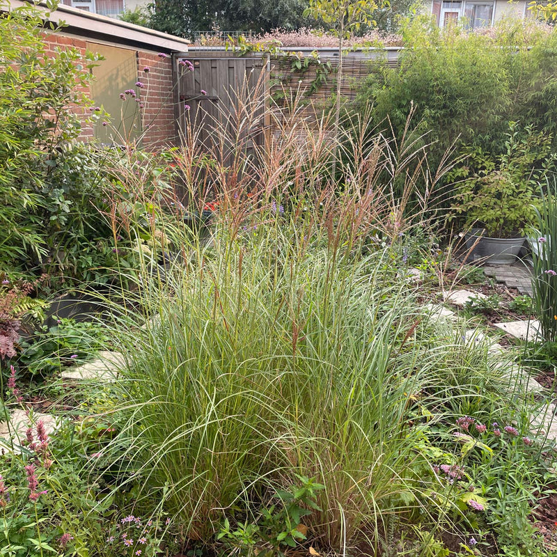 Lekker hoog siergras dat jaarrond staat te pronken. Wordt 100-150cm hoog en kan wel 50cm breed worden. Bloeit in september met pluimen die van roodachtig naar beige kleuren.