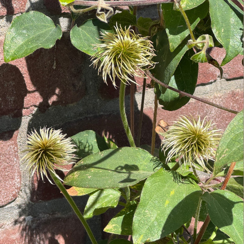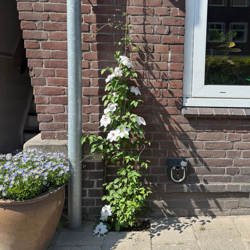 De eerste bloei is rond mei-juni, de tweede bloei van Clematis Miss Bateman volgt tussen juli en september. Let op: deze Clematis heeft een iets nodig om zich aan vast te winden, en kan jouw hulp en begeleiding daarbij goed gebruiken.