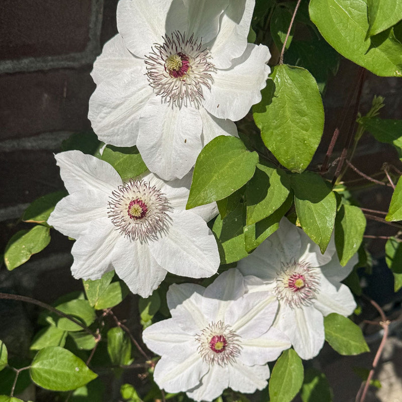 Leid haar langs je schutting, gevel of pergola en je geniet het hele seizoen van de grote witte bloemen met donkerrode meeldraden. Bijen en vlinders zijn er ook dol op.
