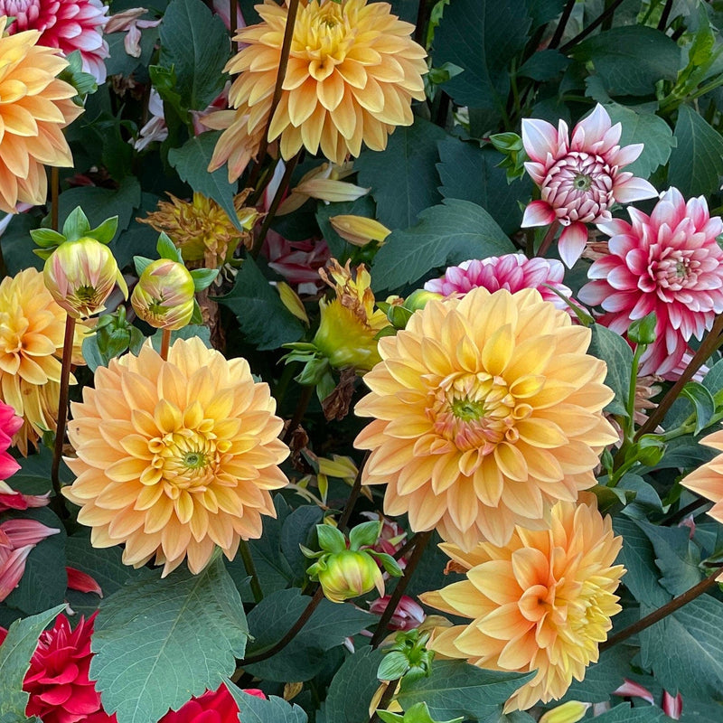 Wat een bollen zachtoranje! Dahlia Sylvia schiet ook lekker de hoogte in: wordt zo'n 90cm lang (in volle grond) en bloeit van juli tot aan de eerste vorst. Super dahlia voor in een vaas. Biologisch geteeld, natuurlijk!