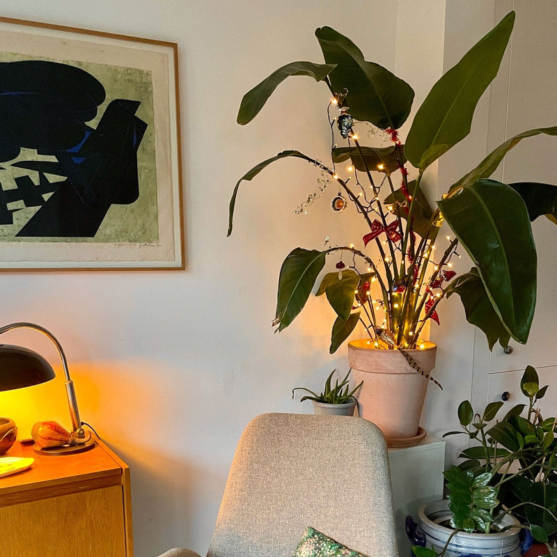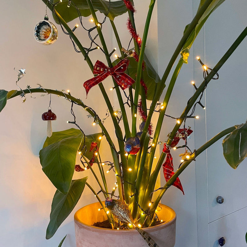 Paradijsvogelplant met kerstlichtjes en kerstballen