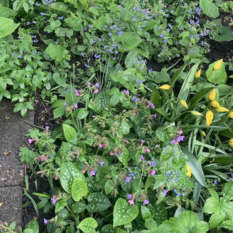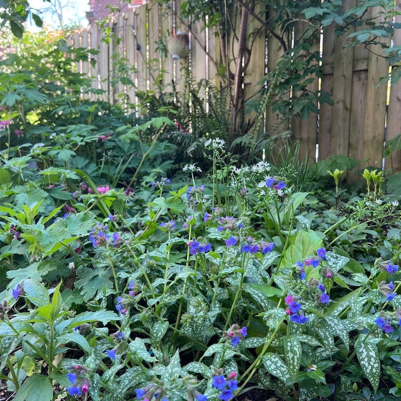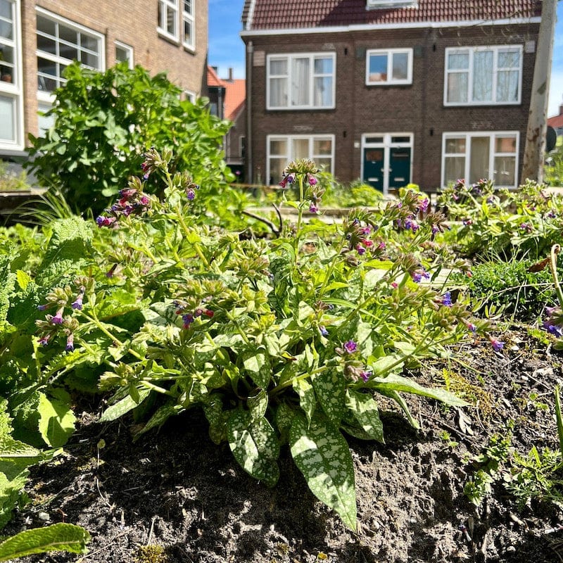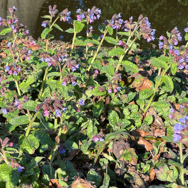 Ohhh wat een vroege vrolijkerd voor een schaduwrijke plek. Tussen maart en mei geven de kleine blauw-paarse bloemen van deze Pulmonaria kleur aan je tot leven komende tuin. Daarna pronkt het prachtige langgerekte blad met witte stippen.