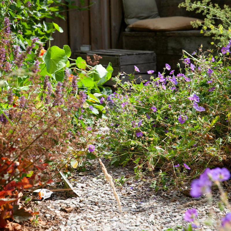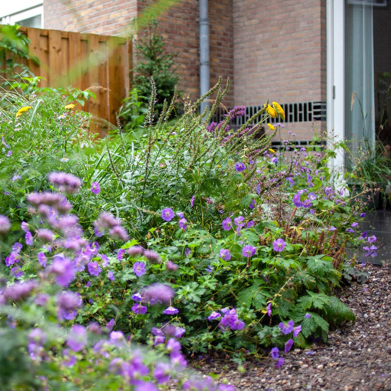 Populairste van alle geraniums! Deze ooievaarsbek bloeit eindeloos lang, van mei tot november met grote lila bloemen met een wit hart. De plant wordt, inclusief bloem, zo'n 30cm hoog en kruipt gemakkelijk verder in je tuin.