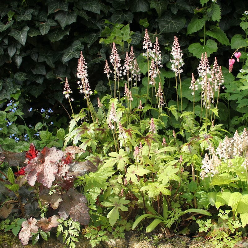 Ruik je het bos? Deze lichtroze bloeiende Tiarella bloeit tussen mei en juni en staat liefst in de half-zon of schaduw, op een plek waar de grond niet te droog wordt. Groeit als een bodembedekker, mooi langs de rand van een paadje of aan de rand van een border.