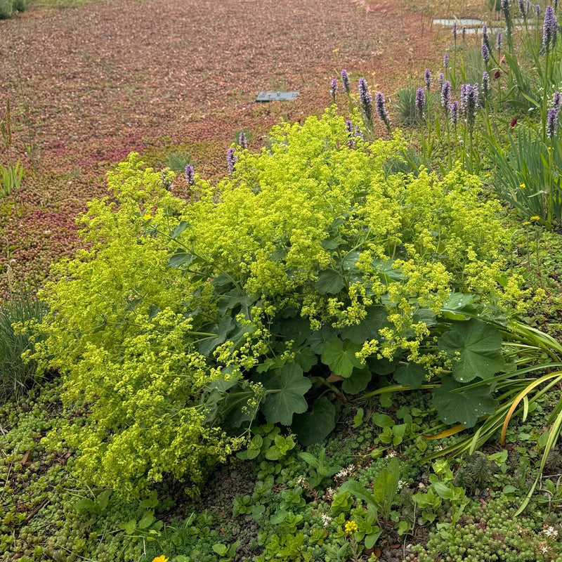 Vrouwenmantel (Alchemilla mollis) is een fijne bodembedekker. De plant wordt niet hoog, het blad blijft zo'n 15cm hoog en de bloemen steken daar in mei en juni tot zo'n 30cm bovenuit. Vrouwenmantel groeit in compacte bollen met lekker veel blad. Het blad is viltachtige grijs-groen, druppels blijven er prachtig op parelen.