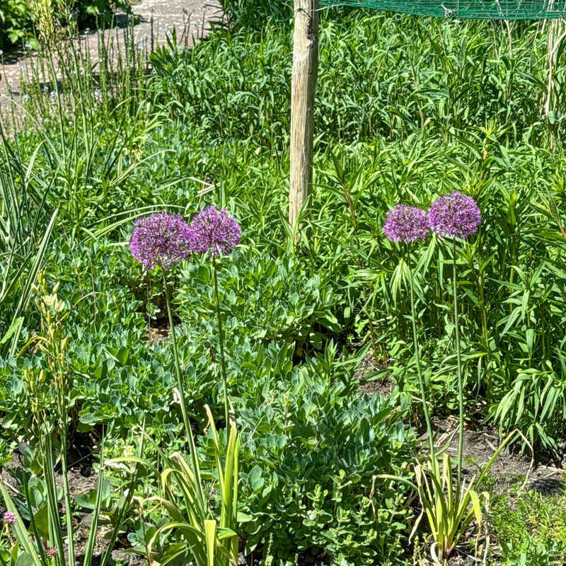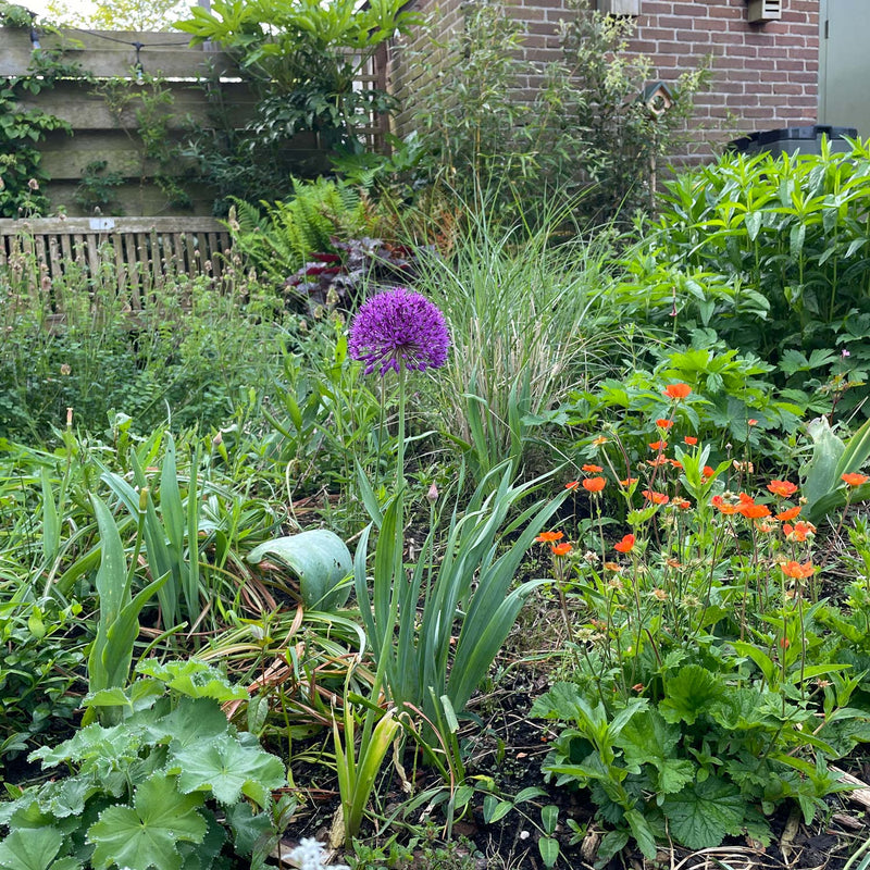 Wow, wat een knoeperd van een paarse bol verschijnt daar in mei-juni! Fier in de lucht stekend op een stevige stengel tot wel 70cm hoog. Weken plezier, ook voor bijen, hommels en vlinders. Combineert mooi met grassen. Laat Allium Purple Sensation gewoon in de grond zitten, verrast ze je volgend jaar weer. 5, 30 of 50 bollen per zak. Biologisch gekweekt, natuurlijk.
