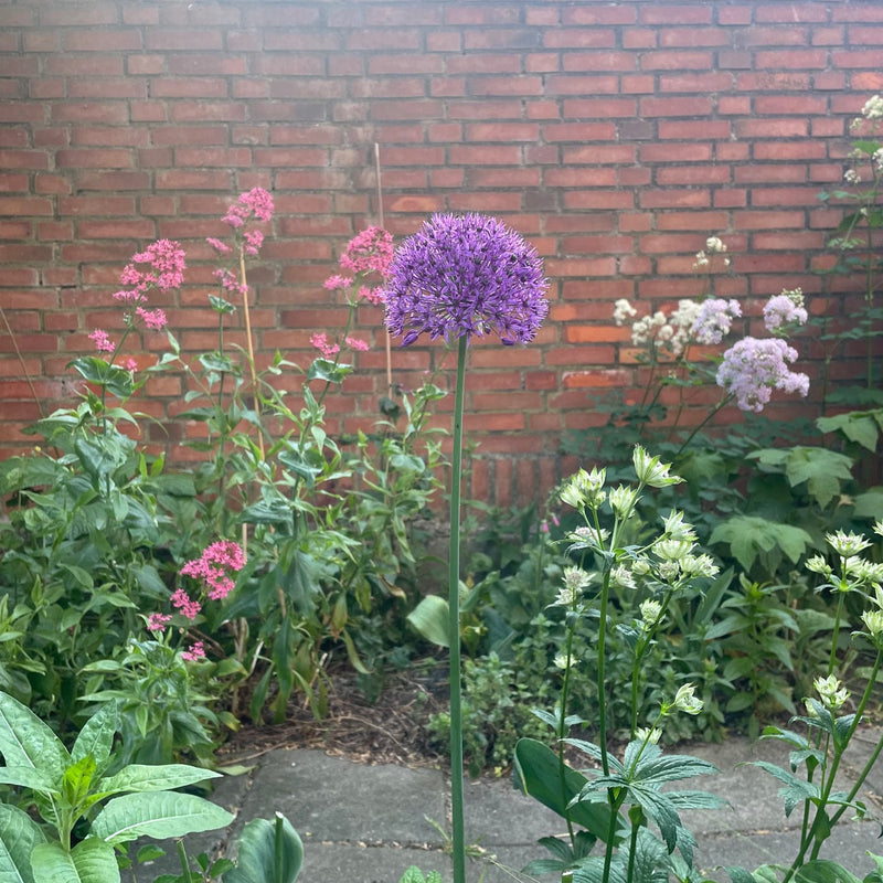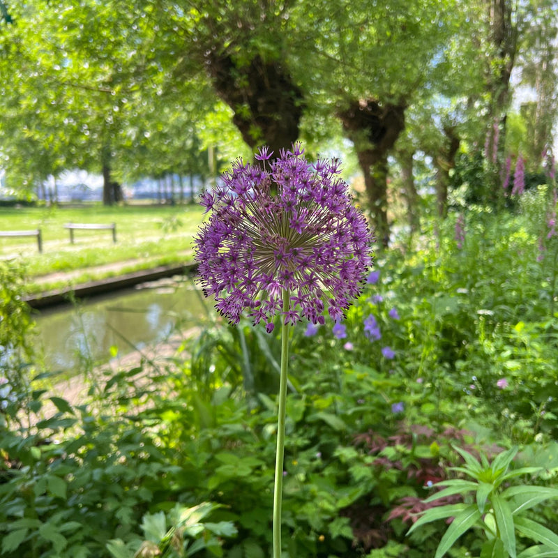 Het Nederlandse woord voor Allium is misschien wat minder sexy: sierui. Jazeker, uien kunnen fantastisch bloeien. Laat je bieslook ook eens bloeien, dat is een soort mini-Allium! Deze Allium Purple Sensation steekt flink de lucht in, kan wel 70cm hoog worden. Het blad blijft laag bij de grond, waardoor een stevige stengel de lucht in steekt met de roze-paarse bol er bovenop. Staat prachtig tussen siergrassen, bijvoorbeeld.