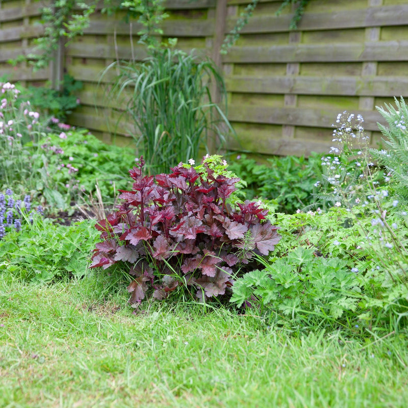 Heuchera Chocolate Ruffles heeft chocoladekleurig blad en steekt daardoor heel mooi af tussen de groene planten. Wil je de rand van je border wat pezzaz geven: deze Heuchera springt eruit.
