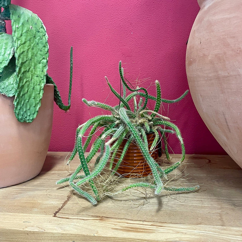 Je zou het niet denken als je deze vetplant, een epifyt die oorspronkelijk op bomen groeit in de Caraïben, klein koopt, maar het kan een gigant worden, een wirwar van slangen die kronkelen langs alles wat in hun buurt staat. Na een jaar of zes kan de plant gaan bloeien, en dat doet ze met gigantische bloemen gedurende slechts één nacht. Na die ene nacht van pracht vallen de bloemknoppen af in de volle overtuiging dat voortplanting geregeld is.