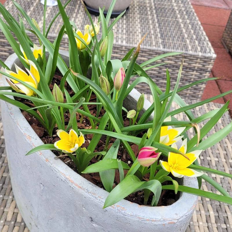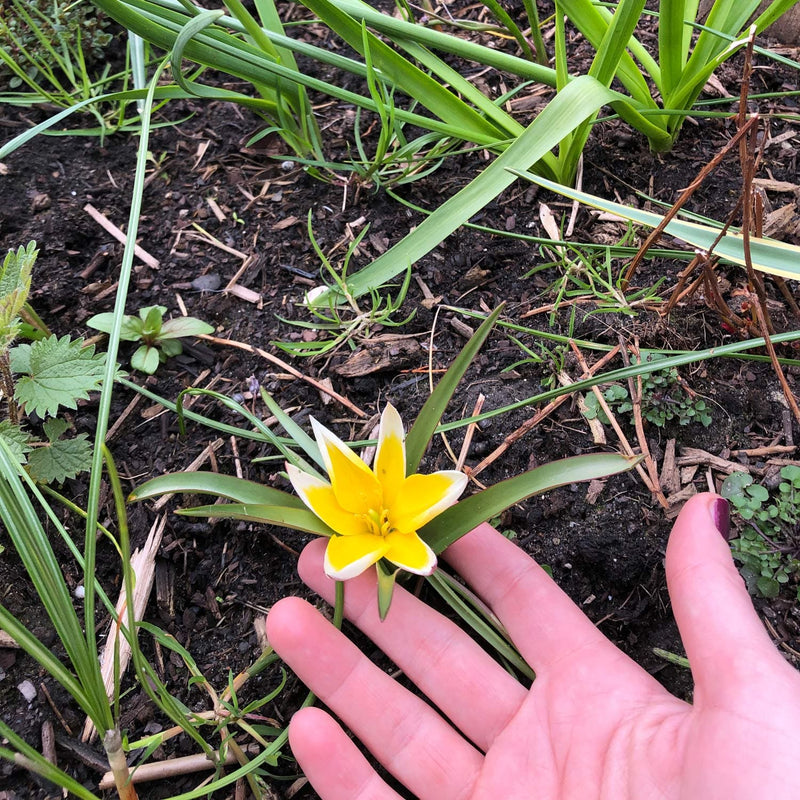 Per bol groeien uit deze laagblijvende Tulp Tarda meerdere bloemen, soms wel vijf uit één bol. De bloemen zijn geel met witte punten aan de bloemblaadjes die wijd uit staan. Ook leuk: deze laagblijvende tulp biedt wel voeding aan bijen en hommels, in tegenstelling tot de meeste hoge tulpen. Bovendien verwildert 'ie gemakkelijk: over twee jaar heb je er een stuk meer.