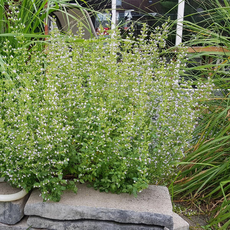 Een echte bodembedekker met bossige groeiwijze. Calamintha verpsreidt een heerlijke muntgeur die eindeloos veel bijen en vlinders trekt. De muntachtige blaadjes zijn ook te gebruiken in de keuken! In het voorjaar volledig snoeien en bij strenge vorst de plant beschermen. Staat liefst op een wat drogere, zonnige plek.