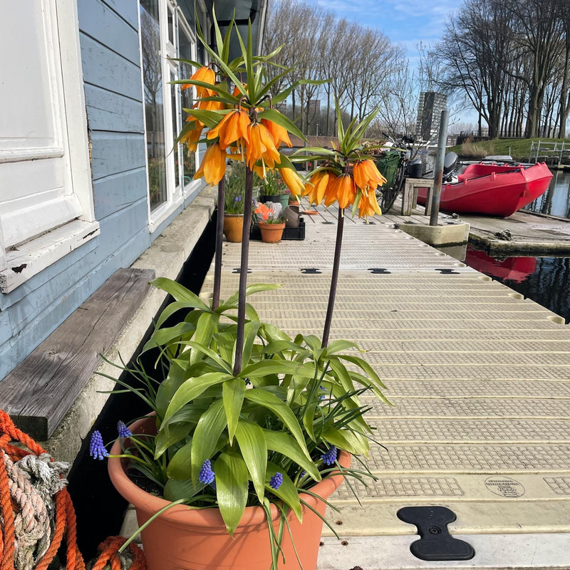 De Fritillaria Early Dream heeft opvallende, klokvormige oranje bloemen met dieporanje strepen en is een lange tante: ze kan wel 80 cm hoog worden! De botanische naam Fritillaria komt van het Latijnse woord voor ‘dobbelbeker’. Kijk naar de vorm van de bloemen, dan snap je ’m, als je tenminste wel eens gedobbeld hebt. Maar deze majestueuze schoonheid heeft meerdere namen, zoals Keizerskroon, vanwege het kroontje bovenop de bloemen en Apostelbloem, vanwege de 12 bloemen die onder het kroontje hangen.